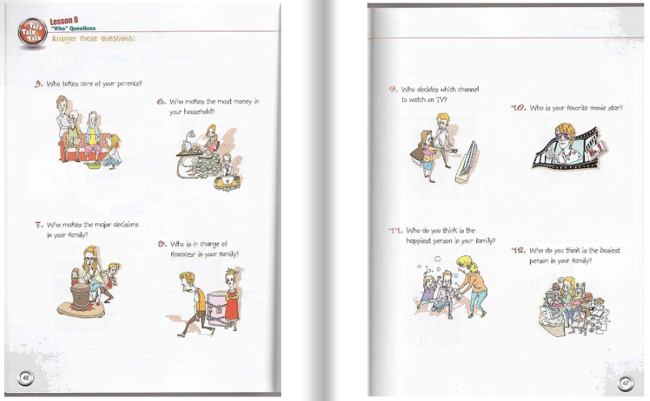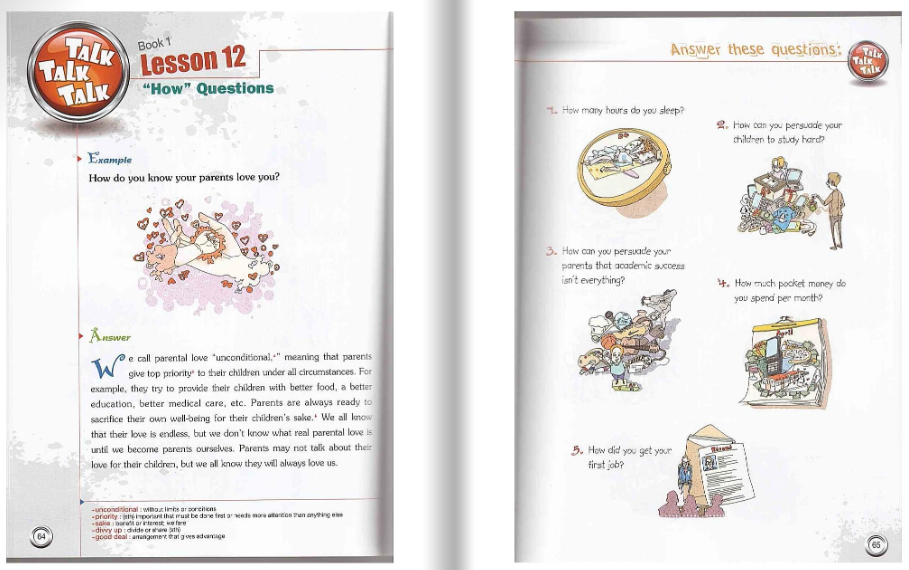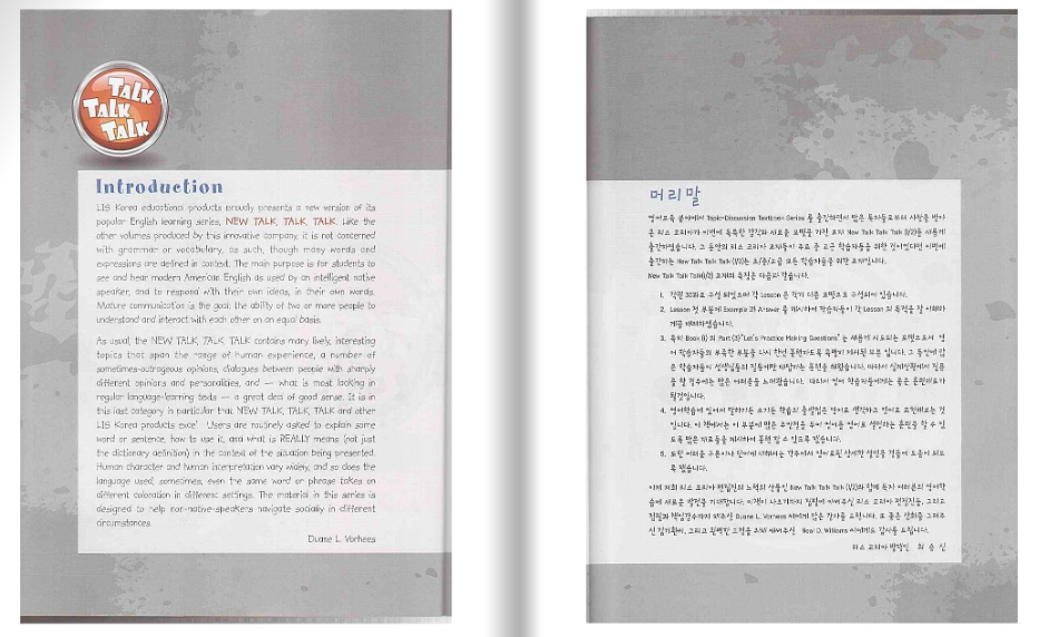 Talk Talk Talk 은 중급 및 상급 학습자를 위해 설계된 영어 회화(ESL) 교재입니다. 이 교재의 가장 큰 특징은 문법 설명 위주의 수업이 아니라, 상황별 대화와 질문 중심의 활동을 통해 의사소통 능력을 향상하는데 중점을 둔 책이라는 점입니다